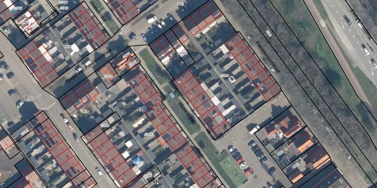 Het perceel waarop Duetzstraat 12 staat heeft een oppervlakte van 2579 m². Dit is een zeer groot perceel. De perceeloppervlakte wordt geregistreerd door het Kadaster. Gedetailleerde informatie over de maten van dit perceel kunt u vinden in het rapport Kadastrale kaart met maatvoering van Duetzstraat 12.