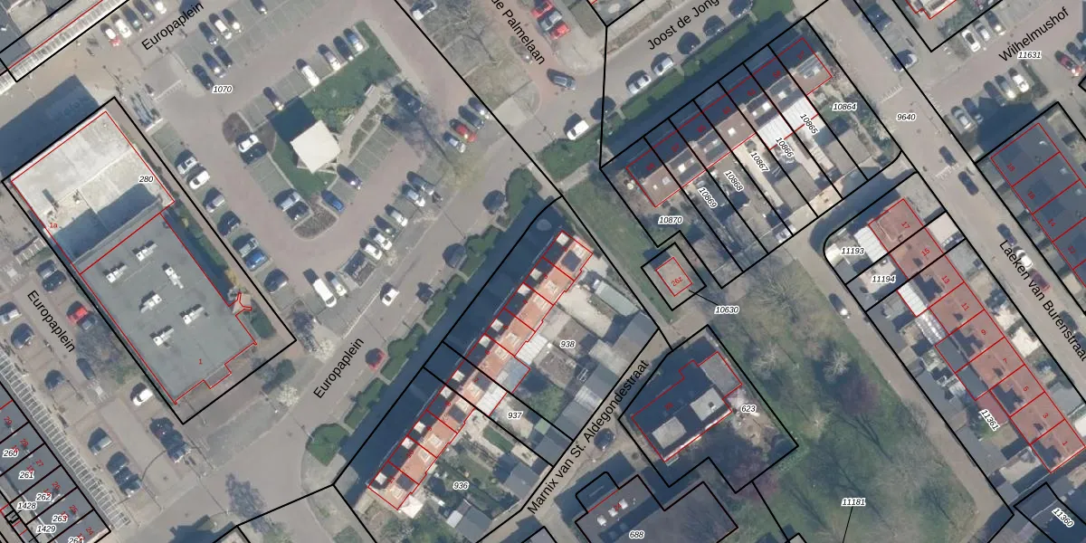 Het perceel waarop Europaplein 3 staat heeft een oppervlakte van 921 m². Dit is een groot perceel. De perceeloppervlakte wordt geregistreerd door het Kadaster. Gedetailleerde informatie over de maten van dit perceel kunt u vinden in het rapport Kadastrale kaart met maatvoering van Europaplein 3.