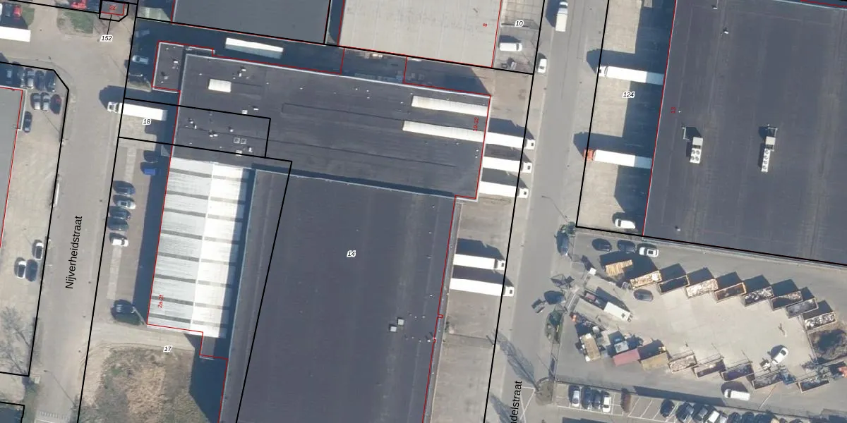 Het perceel waarop Handelstraat 14 staat heeft een oppervlakte van 6435 m². Dit is een zeer groot perceel. De perceeloppervlakte wordt geregistreerd door het Kadaster. Gedetailleerde informatie over de maten van dit perceel kunt u vinden in het rapport Kadastrale kaart met maatvoering van Handelstraat 14.