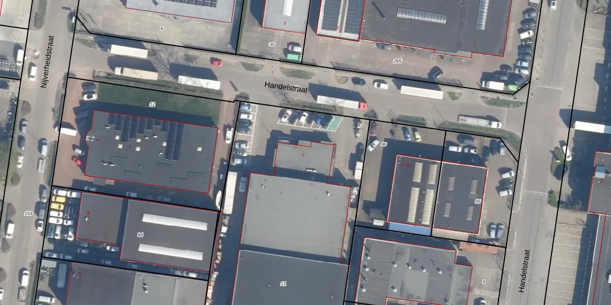 Het perceel waarop Handelstraat 2 staat heeft een oppervlakte van 3770 m². Dit is een zeer groot perceel. De perceeloppervlakte wordt geregistreerd door het Kadaster. Gedetailleerde informatie over de maten van dit perceel kunt u vinden in het rapport Kadastrale kaart met maatvoering van Handelstraat 2.