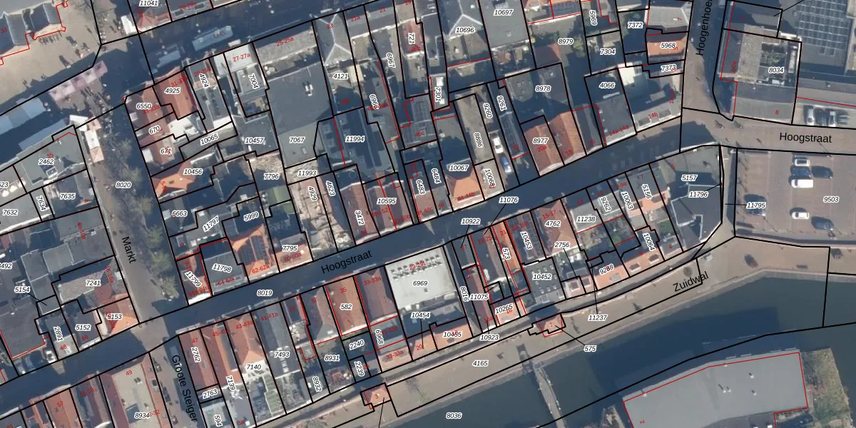 Het perceel waarop Hoogstraat 48 staat heeft een oppervlakte van 63 m². Dit is een klein perceel. De perceeloppervlakte wordt geregistreerd door het Kadaster. Gedetailleerde informatie over de maten van dit perceel kunt u vinden in het rapport Kadastrale kaart met maatvoering van Hoogstraat 48.
