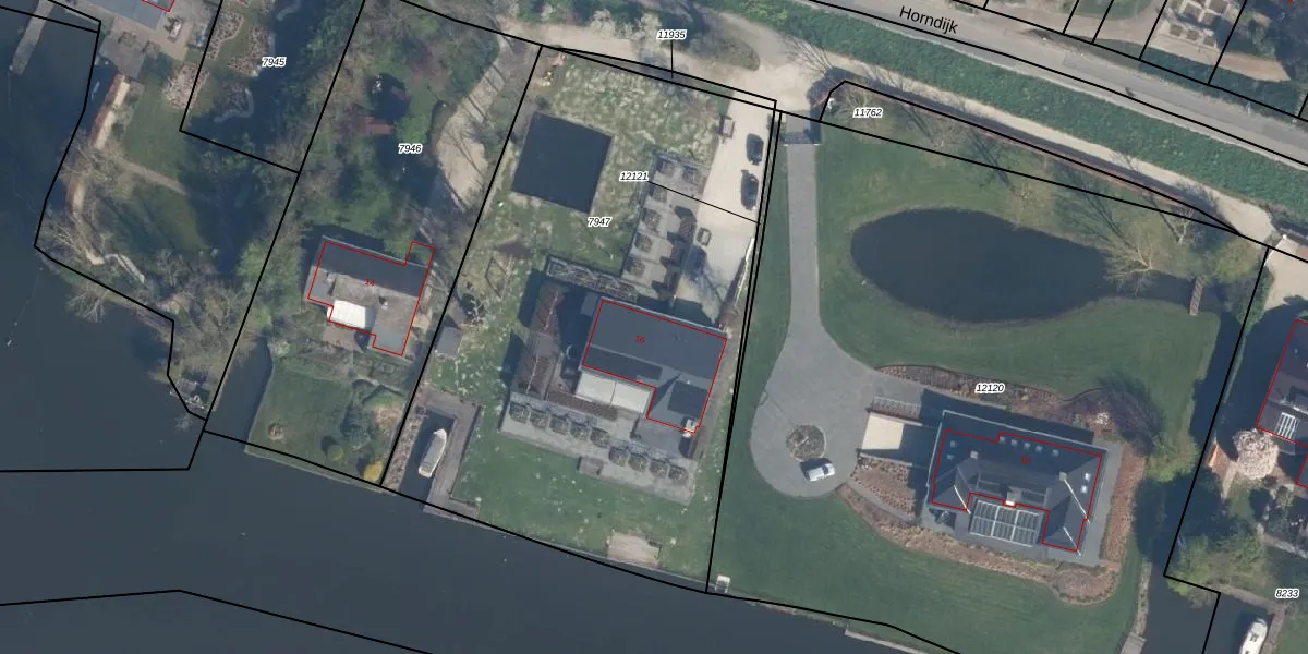 Horndijk 16 is gelegen op kadastraal perceel LDM00B7947. Deze kadastrale aanduiding is uniek en wordt gebruikt door het Kadaster om eigendomsrechten en andere zakelijke rechten vast te leggen. Het perceel maakt onderdeel uit van de kadastrale gemeente Leerdam.