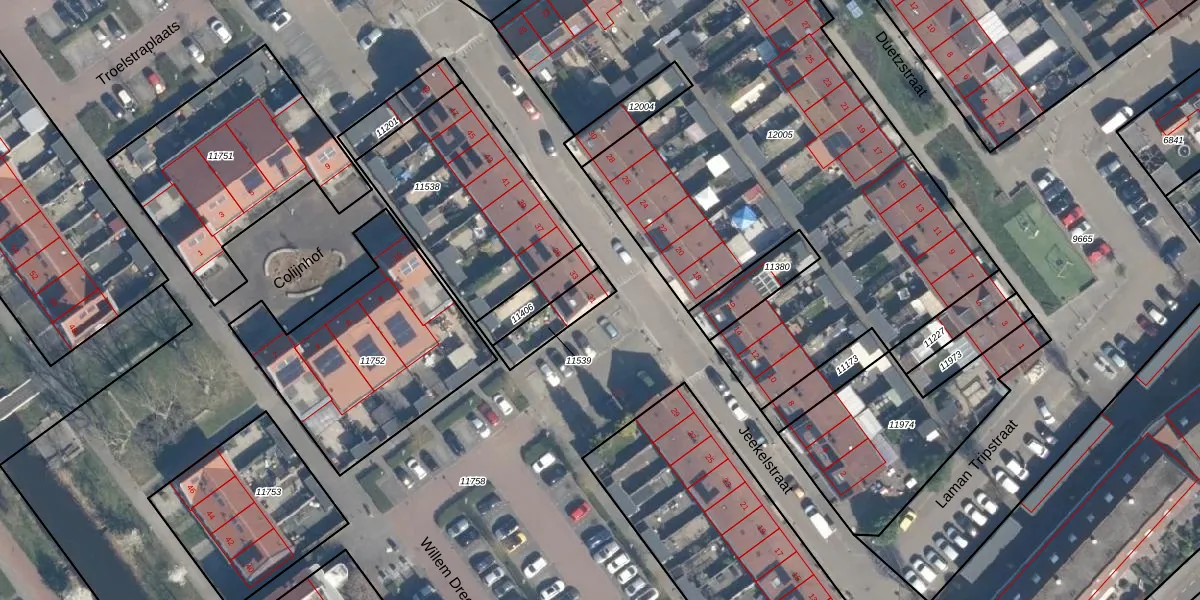 Gebruik de zoekbalk of klik op een perceel voor informatie over de adressen binnen dit perceel.