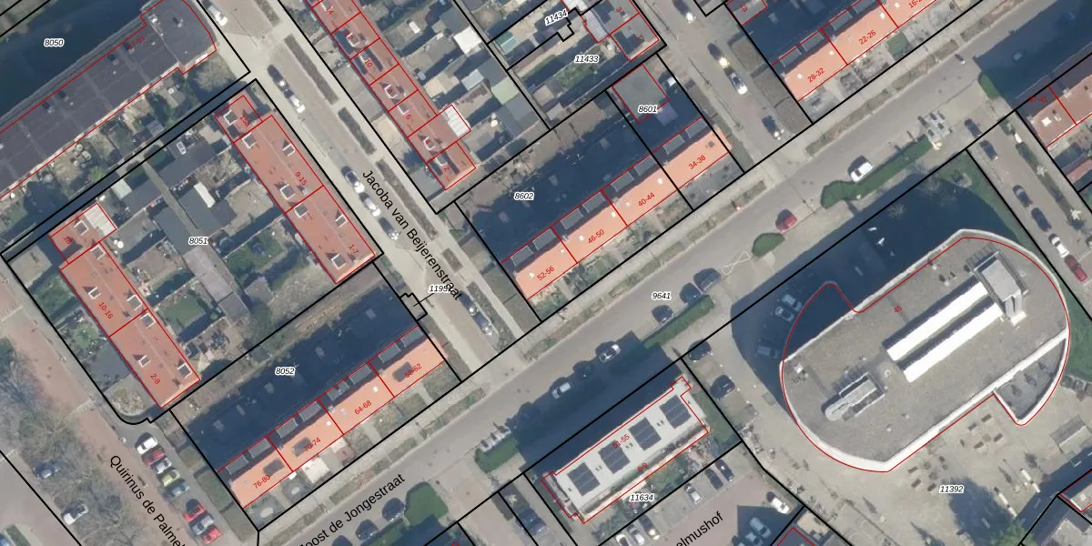 Het perceel waarop Joost de Jongestraat 52 staat heeft een oppervlakte van 950 m². Dit is een groot perceel. De perceeloppervlakte wordt geregistreerd door het Kadaster. Gedetailleerde informatie over de maten van dit perceel kunt u vinden in het rapport Kadastrale kaart met maatvoering van Joost de Jongestraat 52.