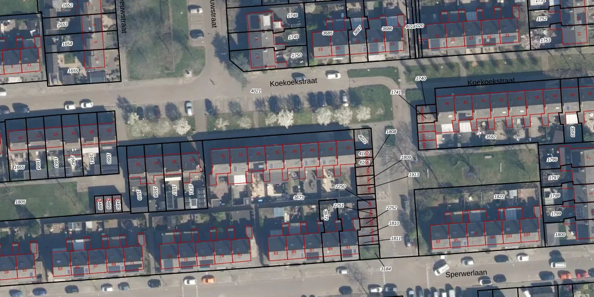 Het perceel waarop Koekoekstraat 38 staat heeft een oppervlakte van 4106 m². Dit is een zeer groot perceel. De perceeloppervlakte wordt geregistreerd door het Kadaster. Gedetailleerde informatie over de maten van dit perceel kunt u vinden in het rapport Kadastrale kaart met maatvoering van Koekoekstraat 38.