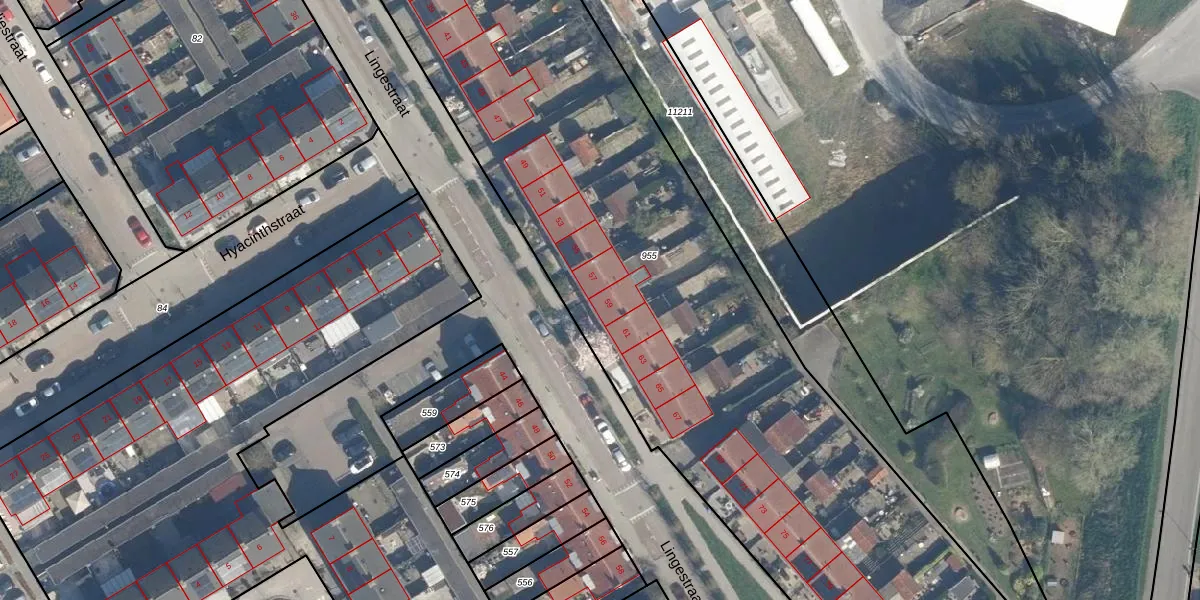 Het perceel waarop Lingestraat 59 staat heeft een oppervlakte van 5085 m². Dit is een zeer groot perceel. De perceeloppervlakte wordt geregistreerd door het Kadaster. Gedetailleerde informatie over de maten van dit perceel kunt u vinden in het rapport Kadastrale kaart met maatvoering van Lingestraat 59.