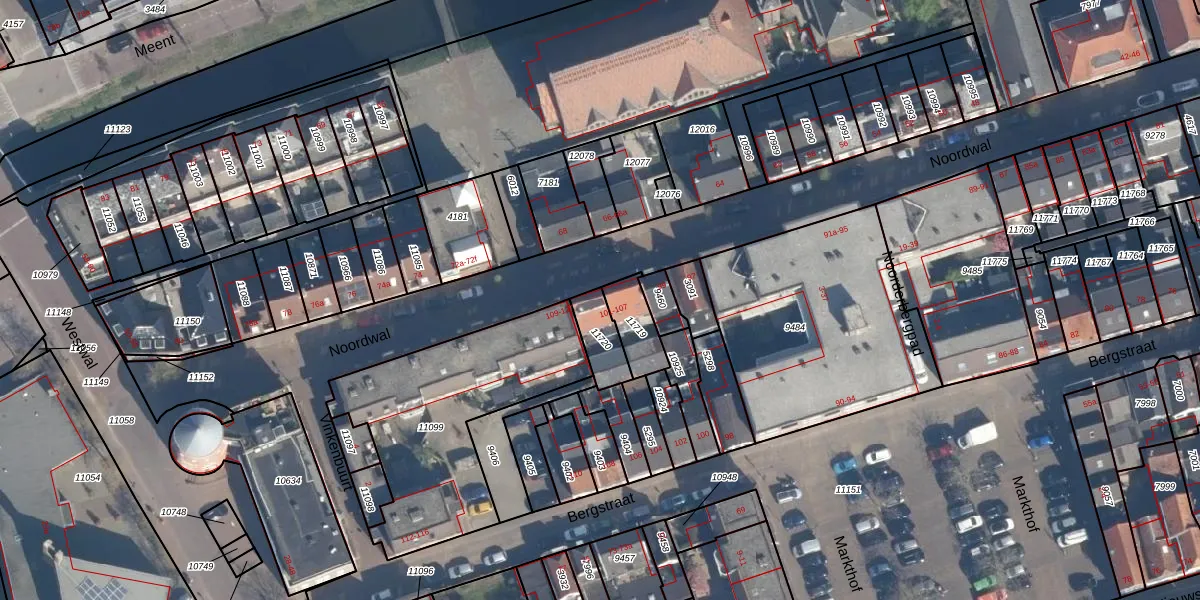 Het perceel waarop Noordwal 105 staat heeft een oppervlakte van 94 m². Dit is een klein perceel. De perceeloppervlakte wordt geregistreerd door het Kadaster. Gedetailleerde informatie over de maten van dit perceel kunt u vinden in het rapport Kadastrale kaart met maatvoering van Noordwal 105.