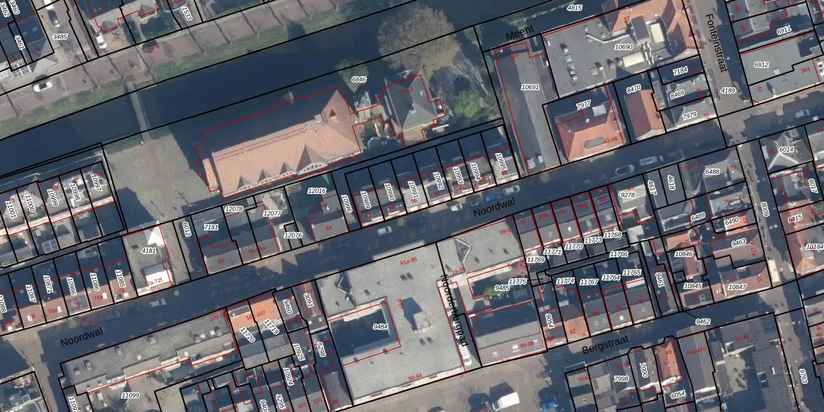 Het perceel waarop Noordwal 56 staat heeft een oppervlakte van 77 m². Dit is een klein perceel. De perceeloppervlakte wordt geregistreerd door het Kadaster. Gedetailleerde informatie over de maten van dit perceel kunt u vinden in het rapport Kadastrale kaart met maatvoering van Noordwal 56.