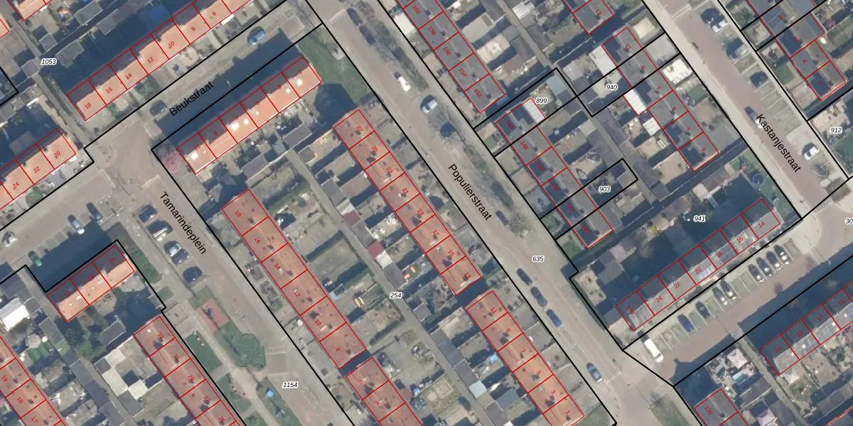 Het perceel waarop Populierstraat 19 staat heeft een oppervlakte van 5615 m². Dit is een zeer groot perceel. De perceeloppervlakte wordt geregistreerd door het Kadaster. Gedetailleerde informatie over de maten van dit perceel kunt u vinden in het rapport Kadastrale kaart met maatvoering van Populierstraat 19.