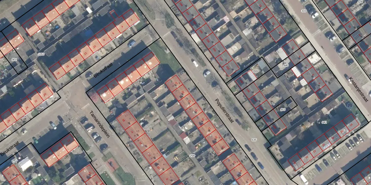 Het perceel waarop Populierstraat 25 staat heeft een oppervlakte van 5615 m². Dit is een zeer groot perceel. De perceeloppervlakte wordt geregistreerd door het Kadaster. Gedetailleerde informatie over de maten van dit perceel kunt u vinden in het rapport Kadastrale kaart met maatvoering van Populierstraat 25.