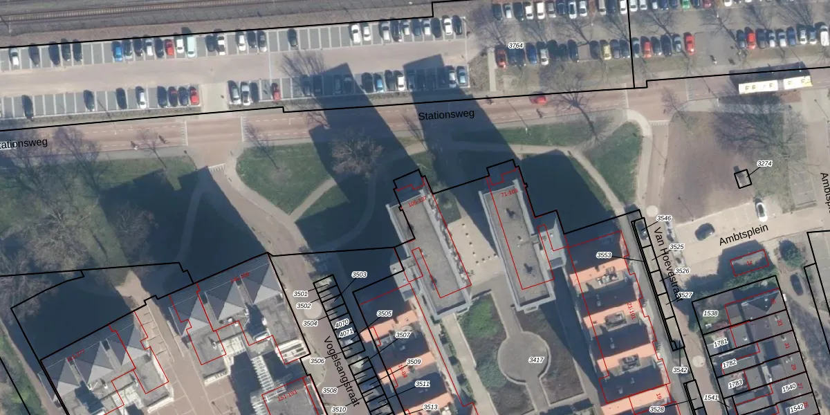 Het perceel waarop Stationsweg 107 staat heeft een oppervlakte van 7525 m². Dit is een zeer groot perceel. De perceeloppervlakte wordt geregistreerd door het Kadaster. Gedetailleerde informatie over de maten van dit perceel kunt u vinden in het rapport Kadastrale kaart met maatvoering van Stationsweg 107.