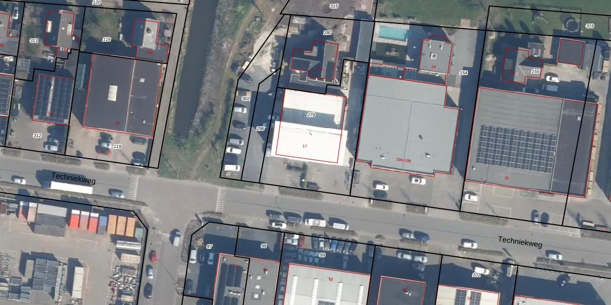 Het perceel waarop Techniekweg 17 staat heeft een oppervlakte van 1048 m². Dit is een zeer groot perceel. De perceeloppervlakte wordt geregistreerd door het Kadaster. Gedetailleerde informatie over de maten van dit perceel kunt u vinden in het rapport Kadastrale kaart met maatvoering van Techniekweg 17.