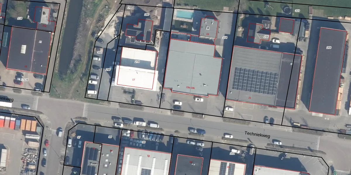 Het perceel waarop Techniekweg 19-a staat heeft een oppervlakte van 2140 m². Dit is een zeer groot perceel. De perceeloppervlakte wordt geregistreerd door het Kadaster. Gedetailleerde informatie over de maten van dit perceel kunt u vinden in het rapport Kadastrale kaart met maatvoering van Techniekweg 19-a.
