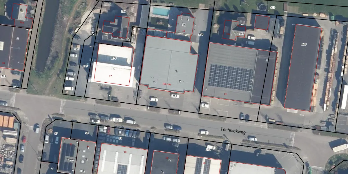 Het perceel waarop Techniekweg 19-b staat heeft een oppervlakte van 2140 m². Dit is een zeer groot perceel. De perceeloppervlakte wordt geregistreerd door het Kadaster. Gedetailleerde informatie over de maten van dit perceel kunt u vinden in het rapport Kadastrale kaart met maatvoering van Techniekweg 19-b.