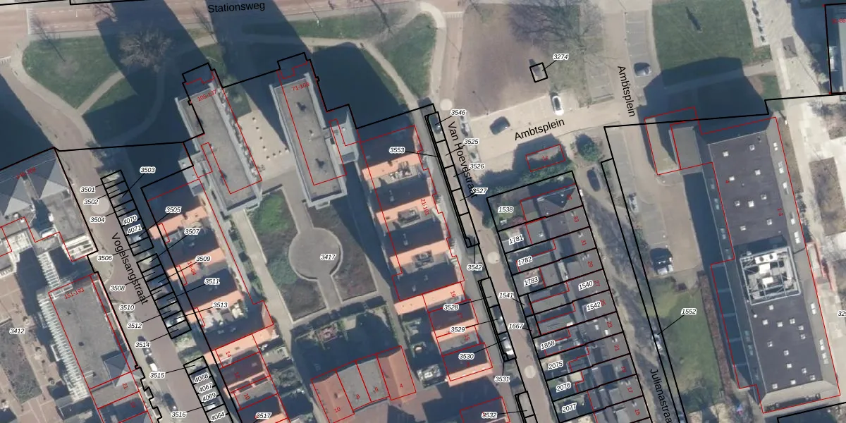 Het perceel waarop Van Hoevestraat 39 staat heeft een oppervlakte van 7525 m². Dit is een zeer groot perceel. De perceeloppervlakte wordt geregistreerd door het Kadaster. Gedetailleerde informatie over de maten van dit perceel kunt u vinden in het rapport Kadastrale kaart met maatvoering van Van Hoevestraat 39.