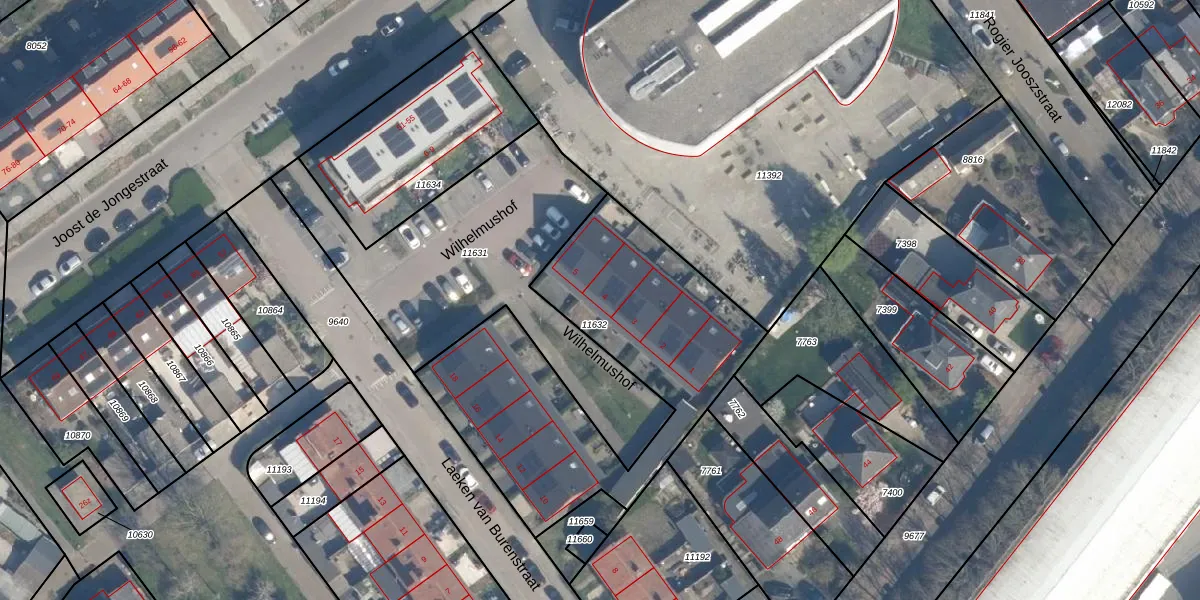 Het perceel waarop Wilhelmushof 4 staat heeft een oppervlakte van 1445 m². Dit is een zeer groot perceel. De perceeloppervlakte wordt geregistreerd door het Kadaster. Gedetailleerde informatie over de maten van dit perceel kunt u vinden in het rapport Kadastrale kaart met maatvoering van Wilhelmushof 4.