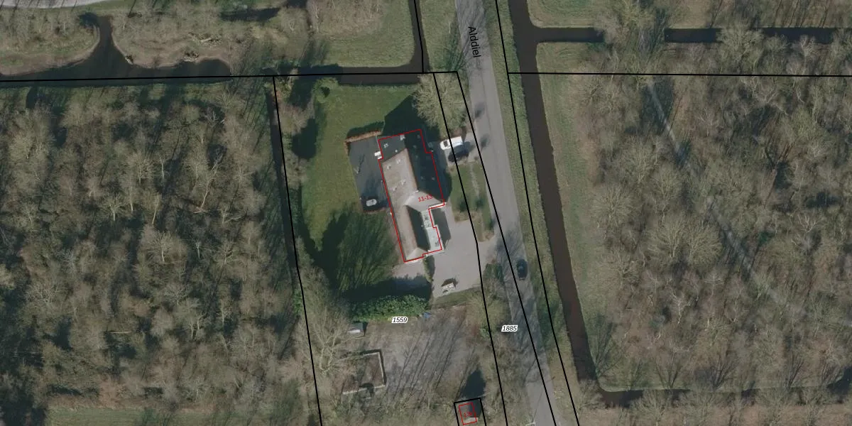 Het perceel waarop Alddiel 13 staat heeft een oppervlakte van 3490 m². Dit is een zeer groot perceel. De perceeloppervlakte wordt geregistreerd door het Kadaster. Gedetailleerde informatie over de maten van dit perceel kunt u vinden in het rapport Kadastrale kaart met maatvoering van Alddiel 13.