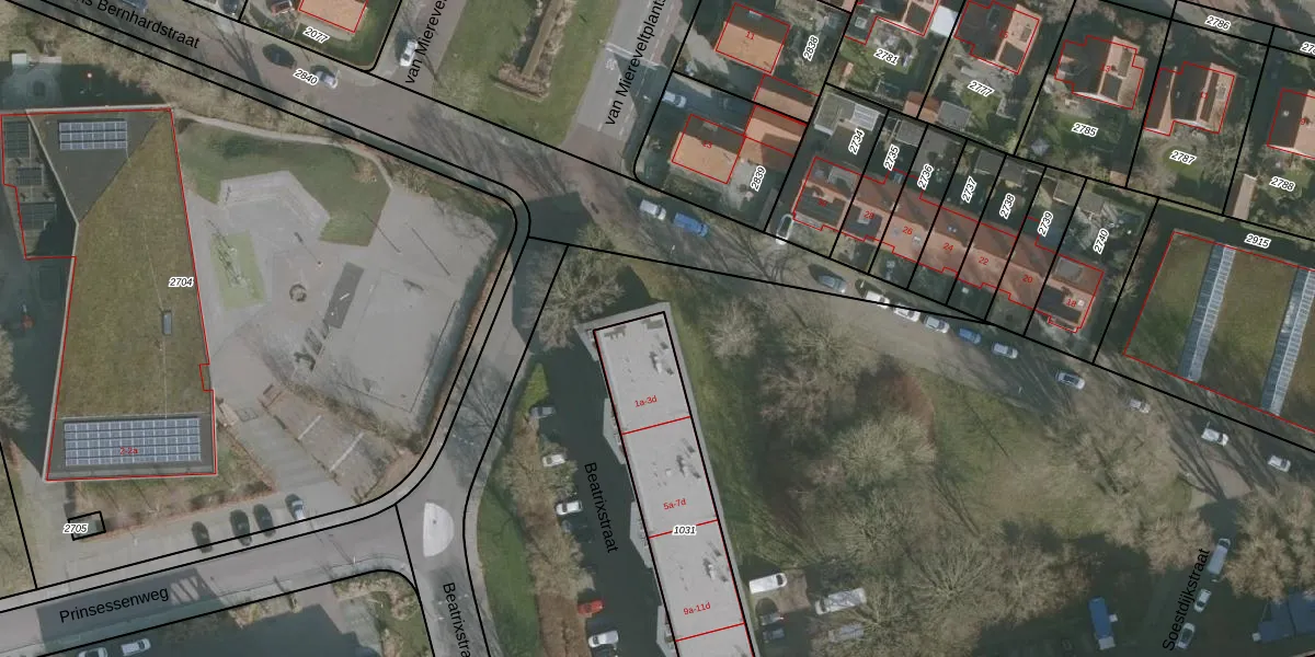 Het perceel waarop Beatrixstraat 1-d staat heeft een oppervlakte van 729 m². Dit is een groot perceel. De perceeloppervlakte wordt geregistreerd door het Kadaster. Gedetailleerde informatie over de maten van dit perceel kunt u vinden in het rapport Kadastrale kaart met maatvoering van Beatrixstraat 1-d.