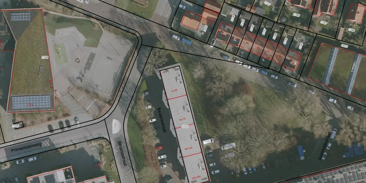 Het perceel waarop Beatrixstraat 3-d staat heeft een oppervlakte van 729 m². Dit is een groot perceel. De perceeloppervlakte wordt geregistreerd door het Kadaster. Gedetailleerde informatie over de maten van dit perceel kunt u vinden in het rapport Kadastrale kaart met maatvoering van Beatrixstraat 3-d.
