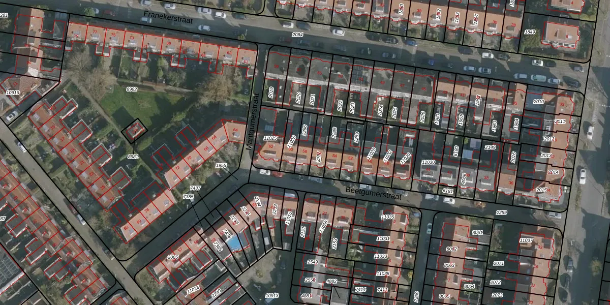 Gebruik de zoekbalk of klik op een perceel voor informatie over de adressen binnen dit perceel.