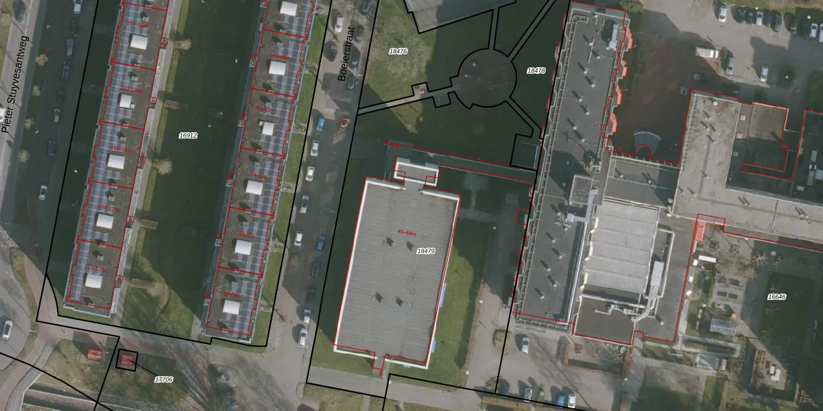 Het perceel waarop Boeierstraat 45-e staat heeft een oppervlakte van 3090 m². Dit is een zeer groot perceel. De perceeloppervlakte wordt geregistreerd door het Kadaster. Gedetailleerde informatie over de maten van dit perceel kunt u vinden in het rapport Kadastrale kaart met maatvoering van Boeierstraat 45-e.