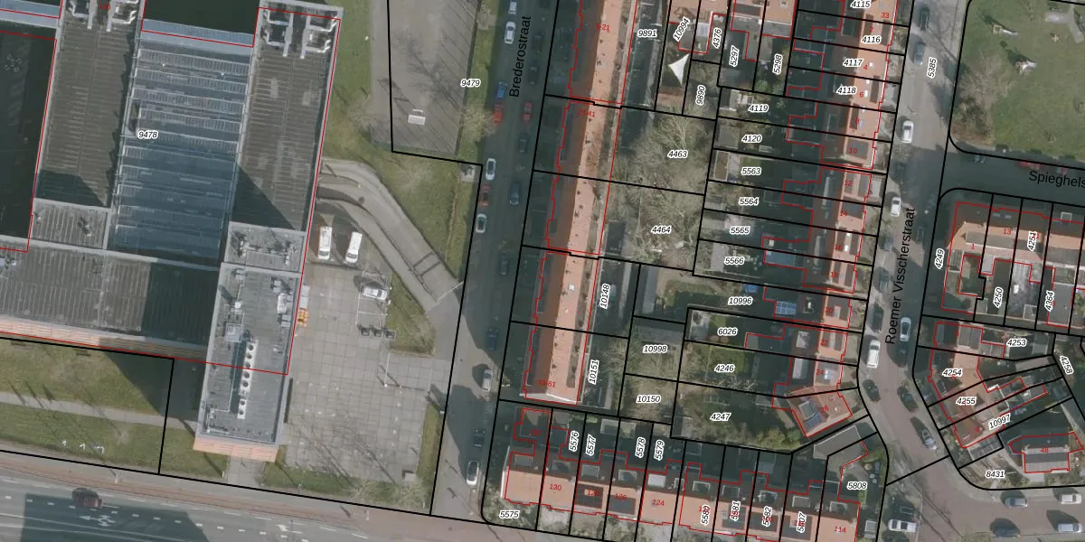 Het perceel waarop Brederostraat 45 staat heeft een oppervlakte van 314 m². Dit is een groot perceel. De perceeloppervlakte wordt geregistreerd door het Kadaster. Gedetailleerde informatie over de maten van dit perceel kunt u vinden in het rapport Kadastrale kaart met maatvoering van Brederostraat 45.