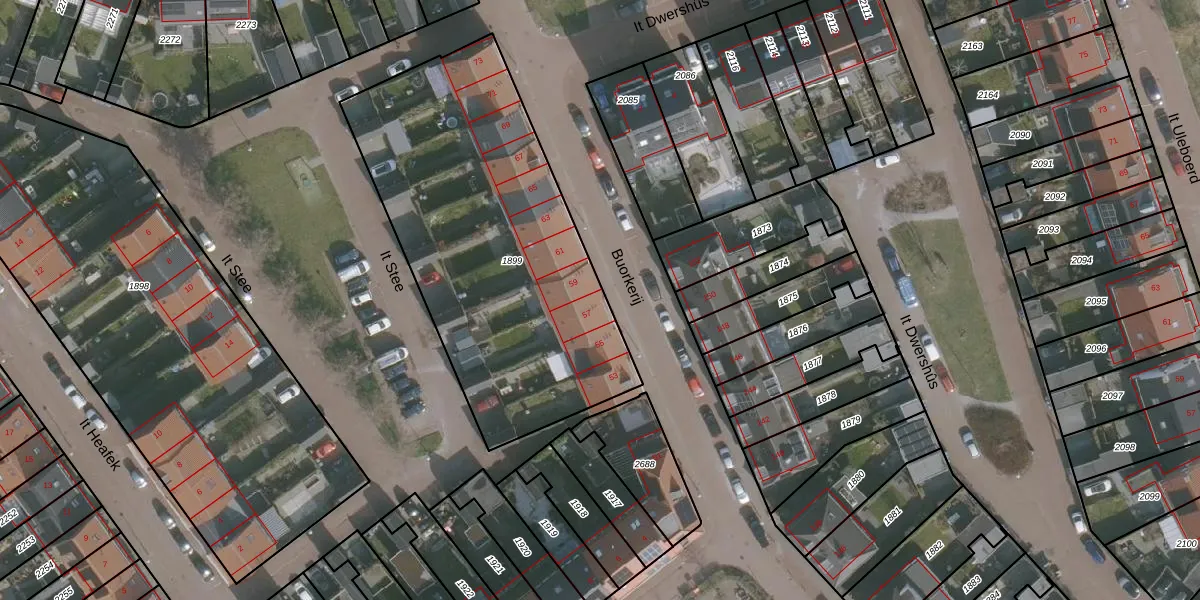 Het perceel waarop Buorkerij 57 staat heeft een oppervlakte van 1777 m². Dit is een zeer groot perceel. De perceeloppervlakte wordt geregistreerd door het Kadaster. Gedetailleerde informatie over de maten van dit perceel kunt u vinden in het rapport Kadastrale kaart met maatvoering van Buorkerij 57.