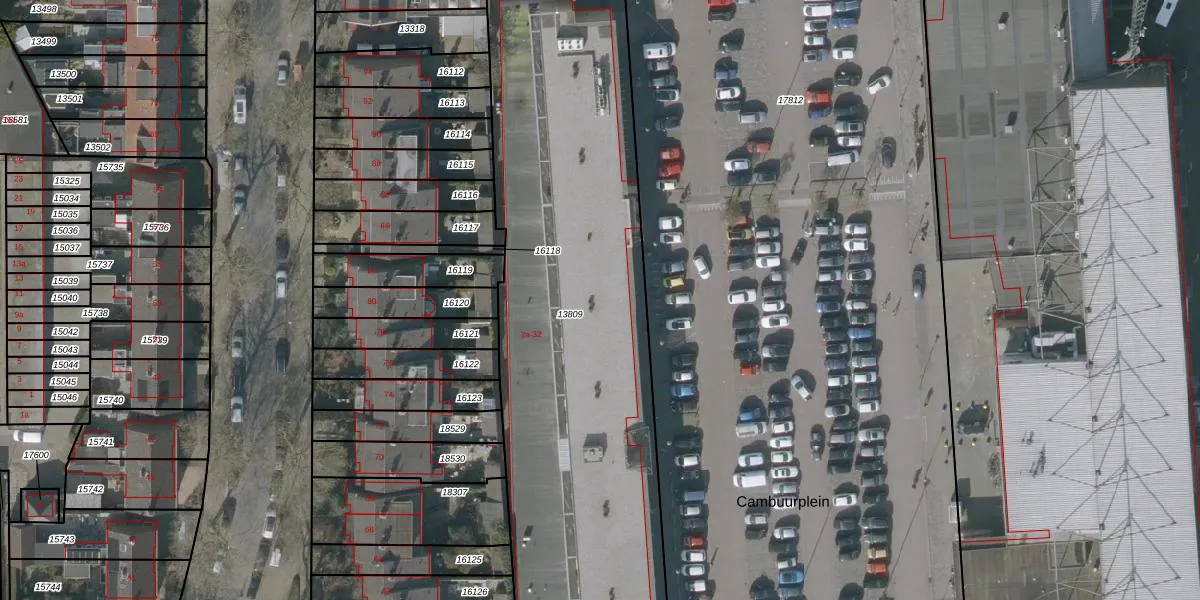 Het perceel waarop Cambuurplein 14 staat heeft een oppervlakte van 2930 m². Dit is een zeer groot perceel. De perceeloppervlakte wordt geregistreerd door het Kadaster. Gedetailleerde informatie over de maten van dit perceel kunt u vinden in het rapport Kadastrale kaart met maatvoering van Cambuurplein 14.