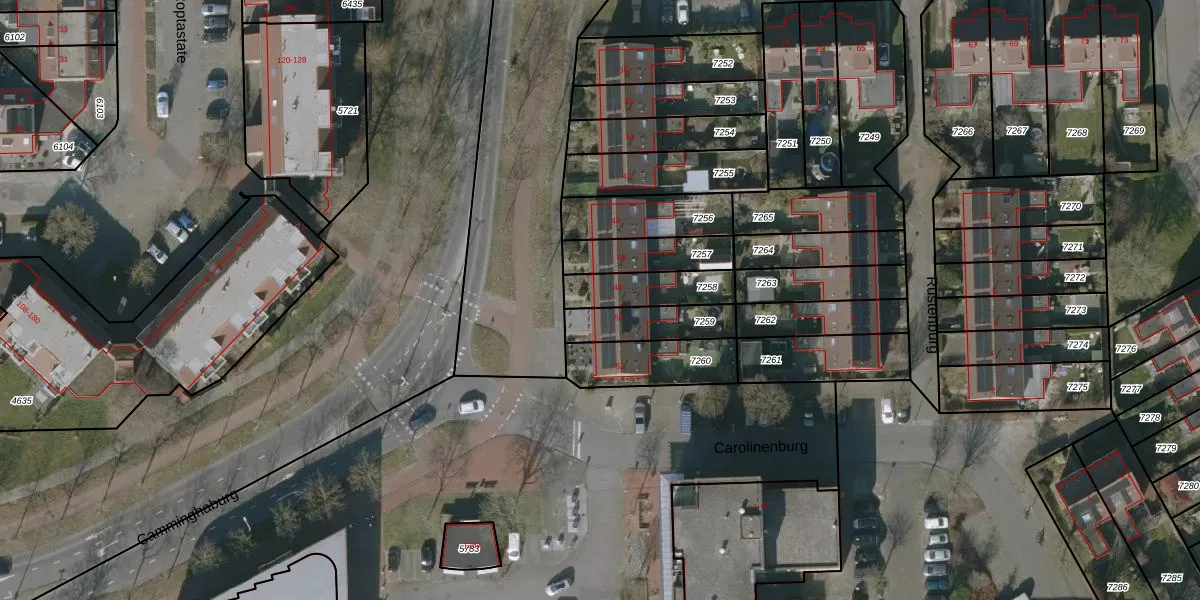 Het perceel waarop Carolinenburg 48 staat heeft een oppervlakte van 163 m². Dit is een middelgroot perceel. De perceeloppervlakte wordt geregistreerd door het Kadaster. Gedetailleerde informatie over de maten van dit perceel kunt u vinden in het rapport Kadastrale kaart met maatvoering van Carolinenburg 48.