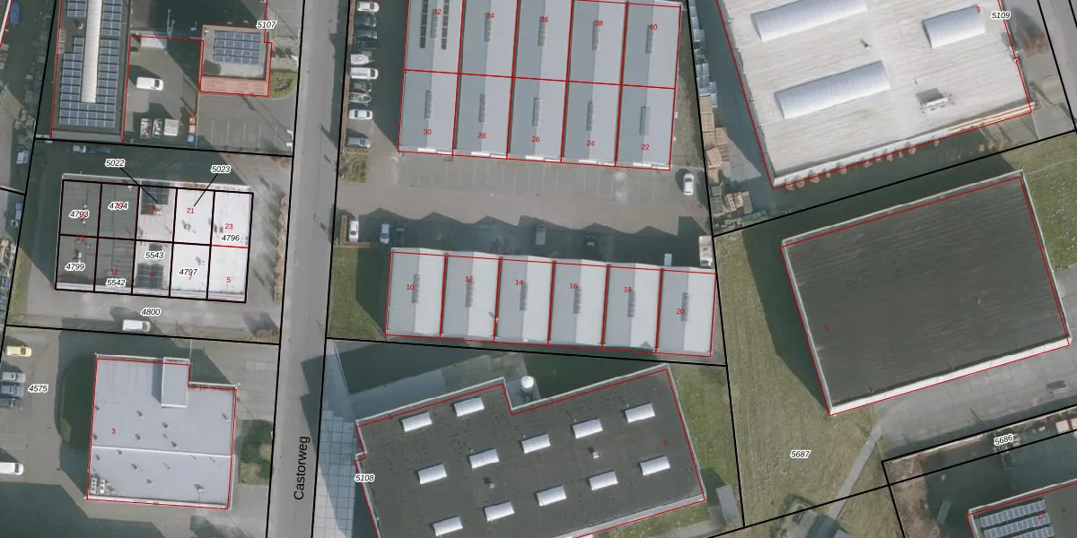 Het perceel waarop Castorweg 14 staat heeft een oppervlakte van 1,0 ha. Dit is een zeer groot perceel. De perceeloppervlakte wordt geregistreerd door het Kadaster. Gedetailleerde informatie over de maten van dit perceel kunt u vinden in het rapport Kadastrale kaart met maatvoering van Castorweg 14.