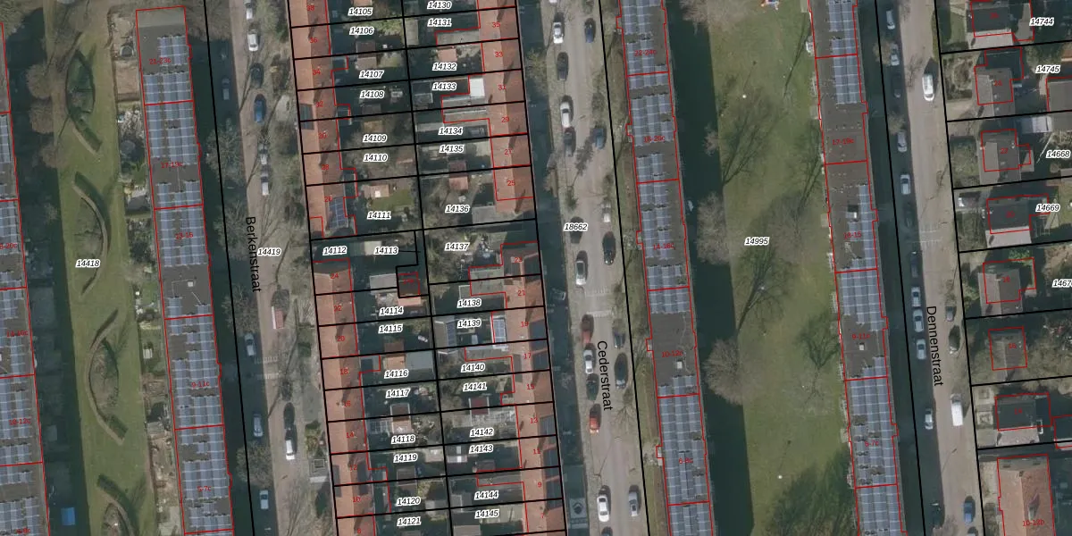 Het perceel waarop Cederstraat 23 staat heeft een oppervlakte van 215 m². Dit is een middelgroot perceel. De perceeloppervlakte wordt geregistreerd door het Kadaster. Gedetailleerde informatie over de maten van dit perceel kunt u vinden in het rapport Kadastrale kaart met maatvoering van Cederstraat 23.