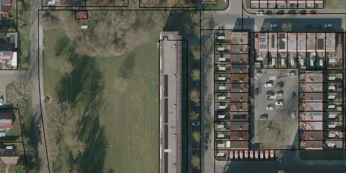 Het perceel waarop de Anjen 5-4 staat heeft een oppervlakte van 2090 m². Dit is een zeer groot perceel. De perceeloppervlakte wordt geregistreerd door het Kadaster. Gedetailleerde informatie over de maten van dit perceel kunt u vinden in het rapport Kadastrale kaart met maatvoering van de Anjen 5-4.