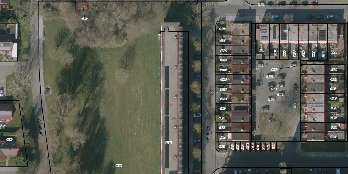 de Anjen 7-7 is gelegen op kadastraal perceel LWD00E5153. Deze kadastrale aanduiding is uniek en wordt gebruikt door het Kadaster om eigendomsrechten en andere zakelijke rechten vast te leggen. Het perceel maakt onderdeel uit van de kadastrale gemeente Leeuwarden.