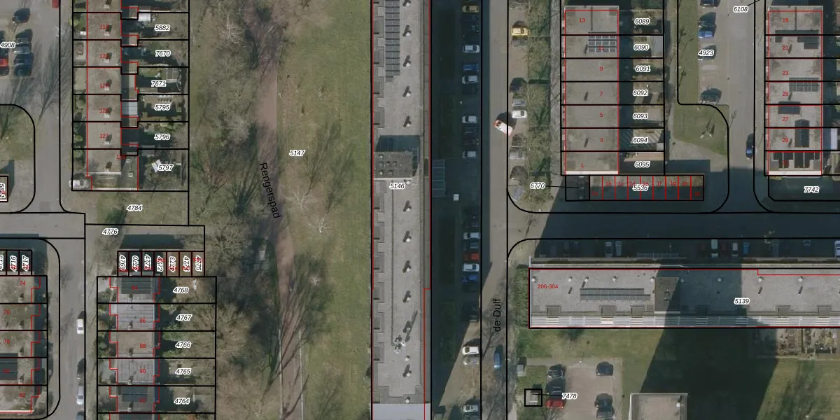 Het perceel waarop de Dulf 184 staat heeft een oppervlakte van 1603 m². Dit is een zeer groot perceel. De perceeloppervlakte wordt geregistreerd door het Kadaster. Gedetailleerde informatie over de maten van dit perceel kunt u vinden in het rapport Kadastrale kaart met maatvoering van de Dulf 184.