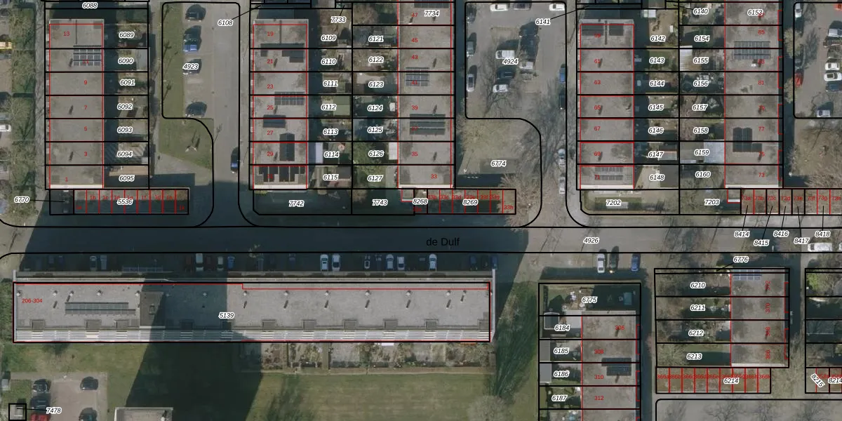 Het perceel waarop de Dulf 33-a staat heeft een oppervlakte van 19 m². Dit is een klein perceel. De perceeloppervlakte wordt geregistreerd door het Kadaster. Gedetailleerde informatie over de maten van dit perceel kunt u vinden in het rapport Kadastrale kaart met maatvoering van de Dulf 33-a.