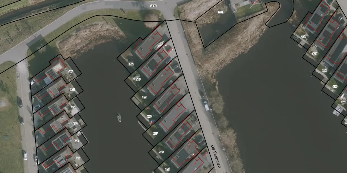 De Fluessen 8 is gelegen op kadastraal perceel HZM00K606. Deze kadastrale aanduiding is uniek en wordt gebruikt door het Kadaster om eigendomsrechten en andere zakelijke rechten vast te leggen. Het perceel maakt onderdeel uit van de kadastrale gemeente Huizum.