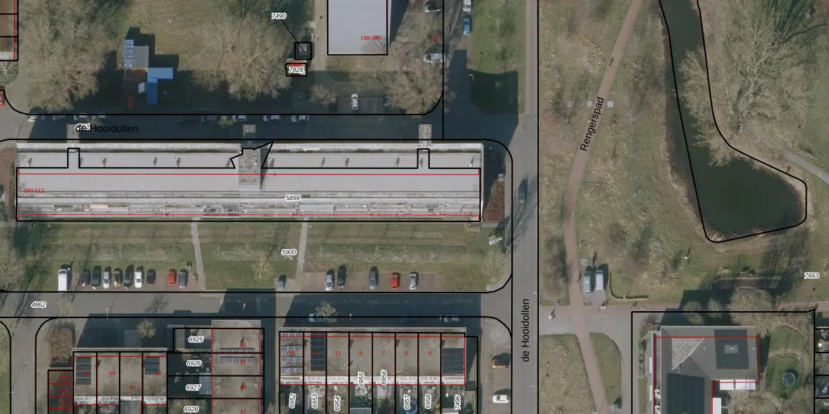 Het perceel waarop de Hooidollen 496 staat heeft een oppervlakte van 1497 m². Dit is een zeer groot perceel. De perceeloppervlakte wordt geregistreerd door het Kadaster. Gedetailleerde informatie over de maten van dit perceel kunt u vinden in het rapport Kadastrale kaart met maatvoering van de Hooidollen 496.