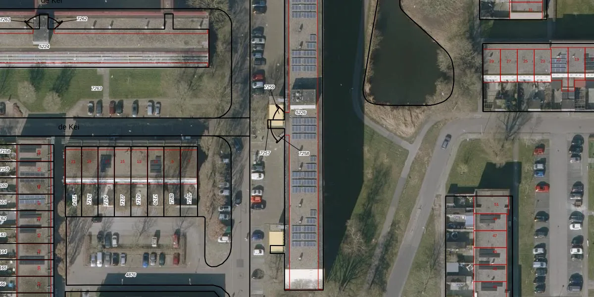 Het perceel waarop de Kei 44 staat heeft een oppervlakte van 1727 m². Dit is een zeer groot perceel. De perceeloppervlakte wordt geregistreerd door het Kadaster. Gedetailleerde informatie over de maten van dit perceel kunt u vinden in het rapport Kadastrale kaart met maatvoering van de Kei 44.