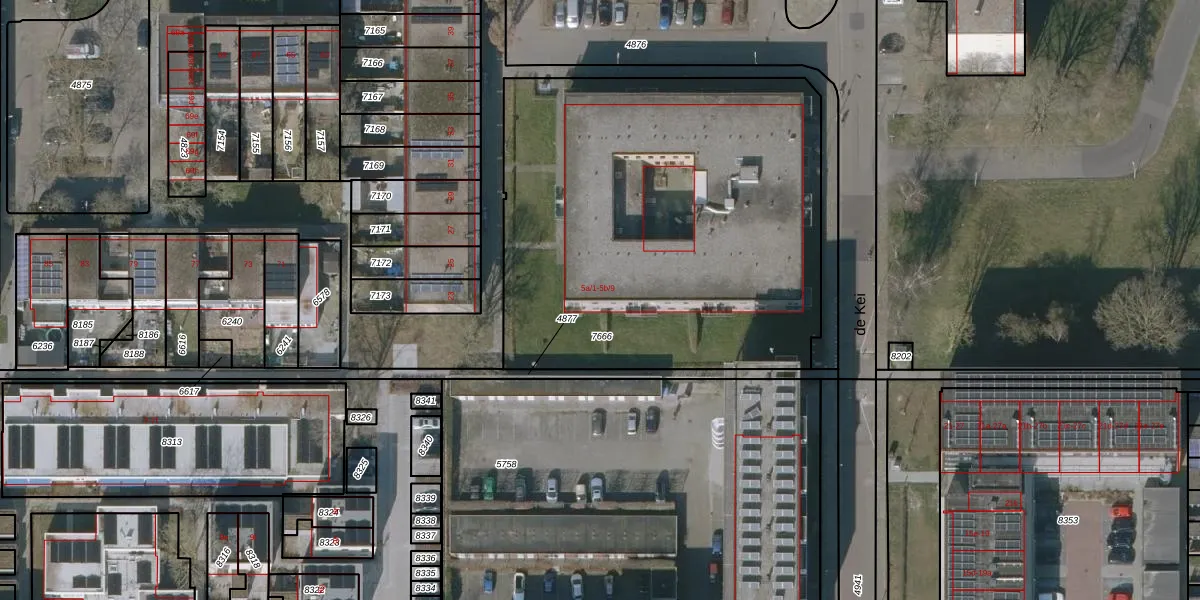 Het perceel waarop de Kei 5-a-6 staat heeft een oppervlakte van 2555 m². Dit is een zeer groot perceel. De perceeloppervlakte wordt geregistreerd door het Kadaster. Gedetailleerde informatie over de maten van dit perceel kunt u vinden in het rapport Kadastrale kaart met maatvoering van de Kei 5-a-6.