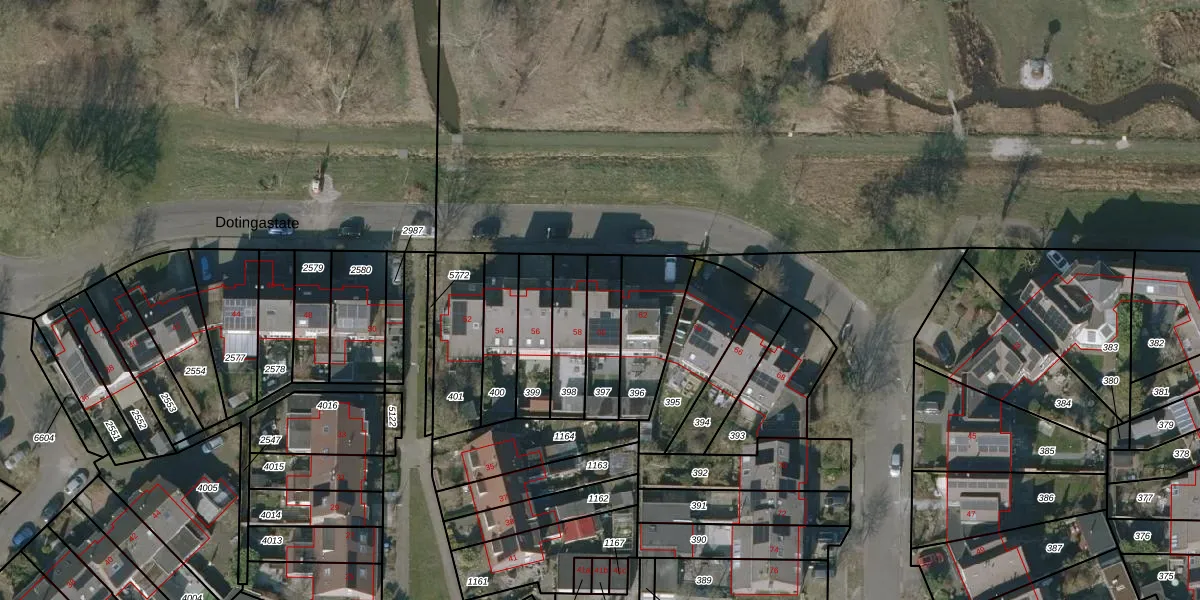Het perceel waarop Dotingastate 60 staat heeft een oppervlakte van 157 m². Dit is een middelgroot perceel. De perceeloppervlakte wordt geregistreerd door het Kadaster. Gedetailleerde informatie over de maten van dit perceel kunt u vinden in het rapport Kadastrale kaart met maatvoering van Dotingastate 60.