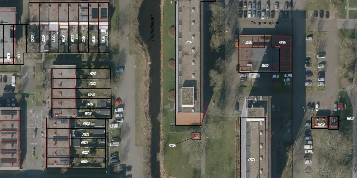 Het perceel waarop Dragoonsplein 217 staat heeft een oppervlakte van 1637 m². Dit is een zeer groot perceel. De perceeloppervlakte wordt geregistreerd door het Kadaster. Gedetailleerde informatie over de maten van dit perceel kunt u vinden in het rapport Kadastrale kaart met maatvoering van Dragoonsplein 217.