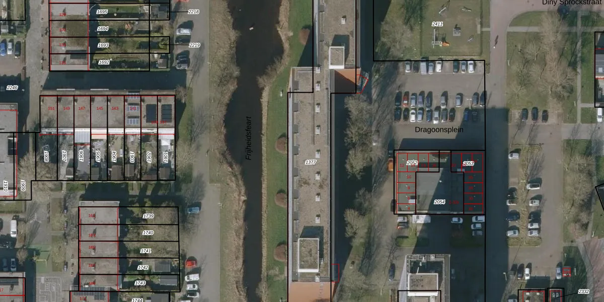 Het perceel waarop Dragoonsplein 233 staat heeft een oppervlakte van 1637 m². Dit is een zeer groot perceel. De perceeloppervlakte wordt geregistreerd door het Kadaster. Gedetailleerde informatie over de maten van dit perceel kunt u vinden in het rapport Kadastrale kaart met maatvoering van Dragoonsplein 233.