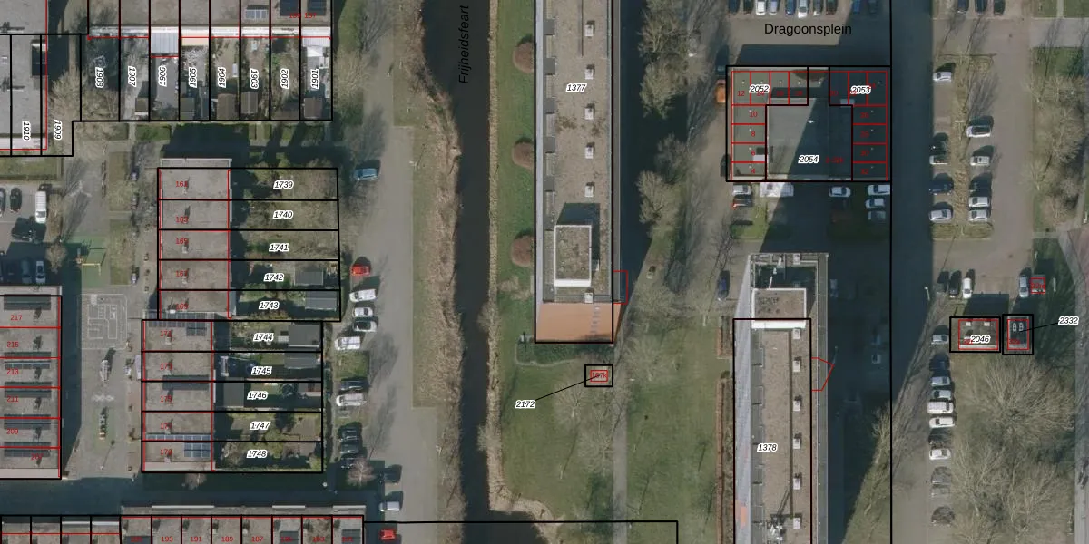 Het perceel waarop Dragoonsplein 247 staat heeft een oppervlakte van 1637 m². Dit is een zeer groot perceel. De perceeloppervlakte wordt geregistreerd door het Kadaster. Gedetailleerde informatie over de maten van dit perceel kunt u vinden in het rapport Kadastrale kaart met maatvoering van Dragoonsplein 247.