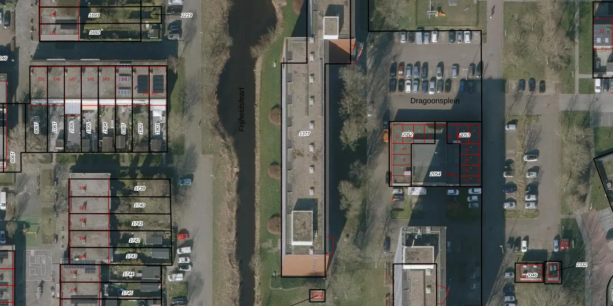 Het perceel waarop Dragoonsplein 305 staat heeft een oppervlakte van 1637 m². Dit is een zeer groot perceel. De perceeloppervlakte wordt geregistreerd door het Kadaster. Gedetailleerde informatie over de maten van dit perceel kunt u vinden in het rapport Kadastrale kaart met maatvoering van Dragoonsplein 305.