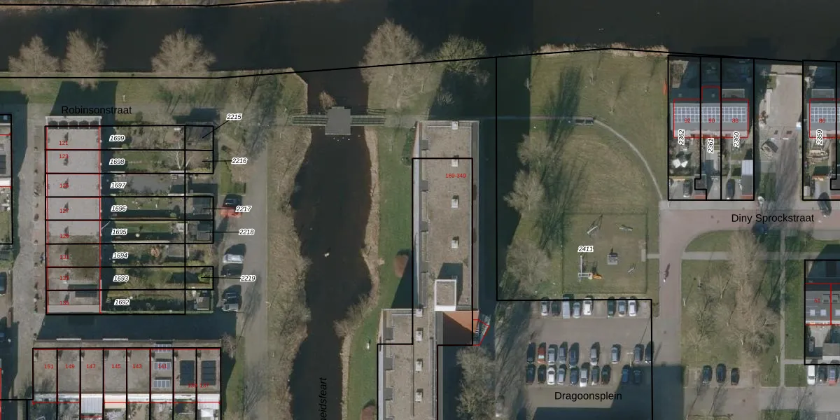 Het perceel waarop Dragoonsplein 349 staat heeft een oppervlakte van 1637 m². Dit is een zeer groot perceel. De perceeloppervlakte wordt geregistreerd door het Kadaster. Gedetailleerde informatie over de maten van dit perceel kunt u vinden in het rapport Kadastrale kaart met maatvoering van Dragoonsplein 349.
