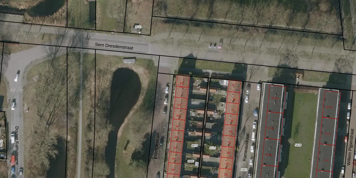 Het perceel waarop Euterpestraat 104 staat heeft een oppervlakte van 1662 m². Dit is een zeer groot perceel. De perceeloppervlakte wordt geregistreerd door het Kadaster. Gedetailleerde informatie over de maten van dit perceel kunt u vinden in het rapport Kadastrale kaart met maatvoering van Euterpestraat 104.