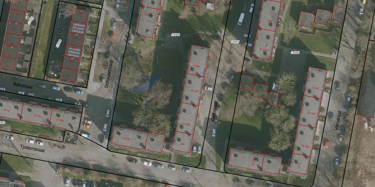 Giekstraat 14-b is gelegen op kadastraal perceel LWD00G14988. Deze kadastrale aanduiding is uniek en wordt gebruikt door het Kadaster om eigendomsrechten en andere zakelijke rechten vast te leggen. Het perceel maakt onderdeel uit van de kadastrale gemeente Leeuwarden.