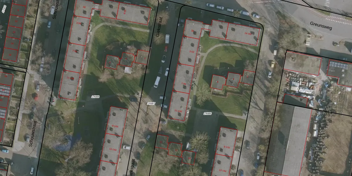 Het perceel waarop Giekstraat 9-d staat heeft een oppervlakte van 6185 m². Dit is een zeer groot perceel. De perceeloppervlakte wordt geregistreerd door het Kadaster. Gedetailleerde informatie over de maten van dit perceel kunt u vinden in het rapport Kadastrale kaart met maatvoering van Giekstraat 9-d.