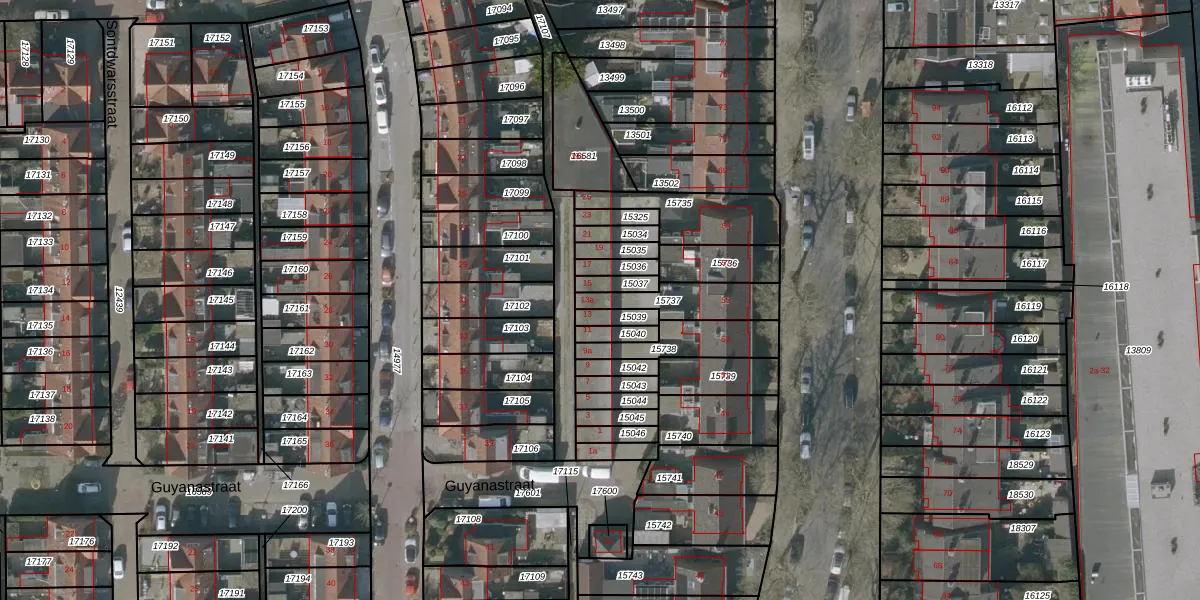 Guyanastraat 13-a is gelegen op kadastraal perceel LWD00G15737. Deze kadastrale aanduiding is uniek en wordt gebruikt door het Kadaster om eigendomsrechten en andere zakelijke rechten vast te leggen. Het perceel maakt onderdeel uit van de kadastrale gemeente Leeuwarden.