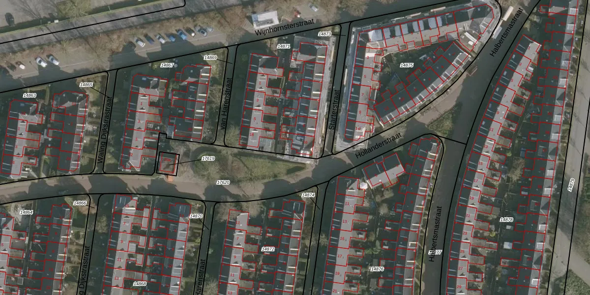Hollanderstraat 16 is gelegen op kadastraal perceel LWD00G14871. Deze kadastrale aanduiding is uniek en wordt gebruikt door het Kadaster om eigendomsrechten en andere zakelijke rechten vast te leggen. Het perceel maakt onderdeel uit van de kadastrale gemeente Leeuwarden.